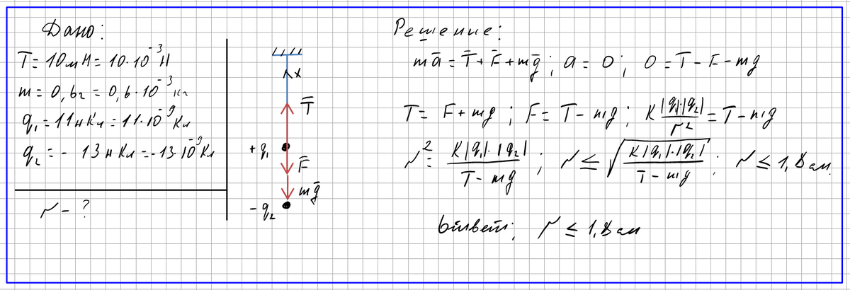 Электростатика. Закон Кулона. Задача№6. Тонкая шелковая нить выдерживает силу натяжения Т=10мН. На этой нити подвешен шарик массой m=0,6 г, имеющий положительный заряд q1=11нКл. Снизу в направлении линии подвеса к нему подносят шарик, имеющий отрицательный заряд q2= -13нКл. При каком расстоянии r между шариками нить разорвётся? Для подробного изучения решения задачи посмотрите видео: