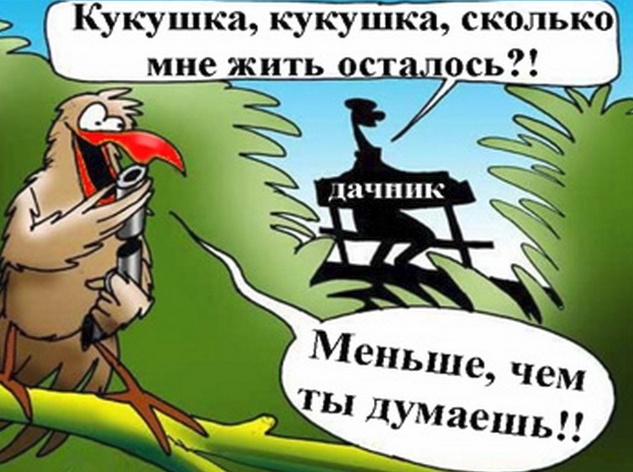 😂 Притащила мужа на огород грядки перекопать, он копает, но видно что ему жуть как неохота, а я рядышком на перевернутое ведро присела тихо тепло кукушку кукует. Я ради прикола спрашиваю: «Кукушка-кукушка, сколько мне жить осталось?» Кукушка сразу заткнулась, молчит гадина не издает ни звука, тут муж разогнулся уперся в лопату и говорит: «Подожду немного пожалуй» 🤣 Современные реалии- вездесущий Google Maps наконец увидел нашу затрапезную дачу и сфотал мои 6 соток и домишко крупным планом. И все бы ничего даже забавно, но возникла проблема жена ультимативно требует, чтобы я убрал старые покрышки и засохший смородиновый куст. Ей видите ли перед Гуглом неудобно! 🤣 Последнее время заметил странную закономерность, когда мы приезжаем забирать детей с дачи первым нам навстречу выбегает счастливый и радостный дедушка. 😂 Как приятно сорвать и съесть ягодку прямо с куста, а огурчик прямо с грядки! особенно если они растут на чужом огороде! 🤣- Скажите Рабинович, почему вы продаете св