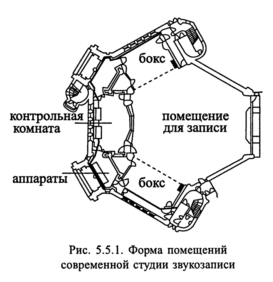 Форма студии имеет существенное значение для обеспечения структуры ранних (в первую очередь боковых)отражений и однородности (диффузности) звукового поля, что очень важно для качественной записи звука. Поэтому большие студии очень часто делаются непрямоугольной формы; примером может служить форма студийного помещения на рис. 5.5.1.