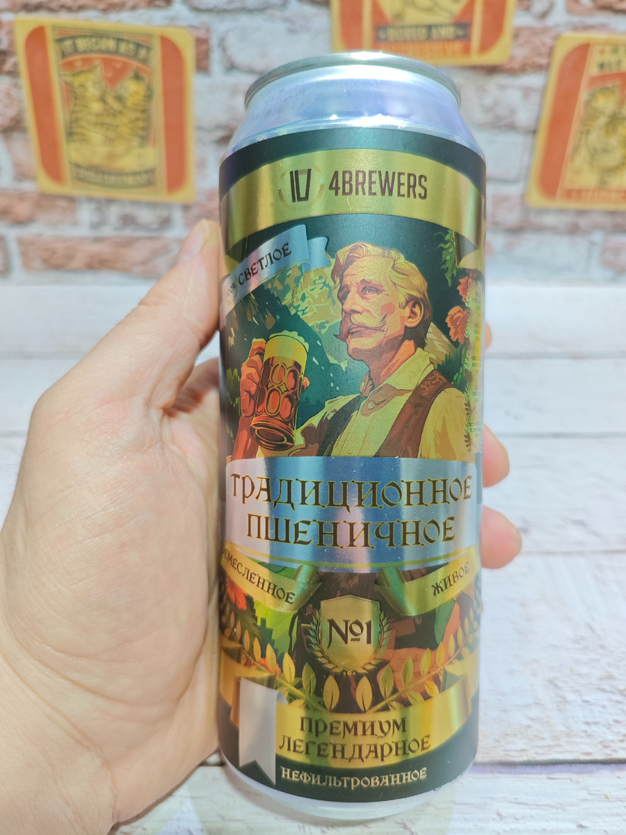 Именно под таким названием это пиво зарегистрировано на UNTAPPD. Сварила это пиво пивоварня 4BREWERS (ООО "Четыре пивовара") в городе Владимир. Оформление топовое, я считаю. Пиво - призёр множества премий. Описание читаем прямо на этикетке: Пиво пшеничное нефильтрованное, также называемое белым - богатый источник витаминов группы B, микроэлементов, железа и аминокислот. Сварено пивоварами-ремесленниками, вдохновленными классическим пшеничным вкусом немецкого пива, после тщательного отбора кандидатов и их продолжительного октябрьского ретрита на баварских островах.