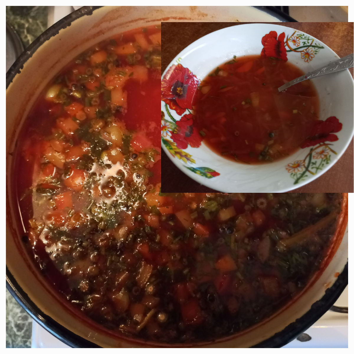 ▪︎ Даю повариться до готовности замороженных овощей и томатного сока, ДОБАВЛЯЮ СВЕКОЛЬНЫЙ НАСТОЙ и заправляю мелко нарезанной зеленью.