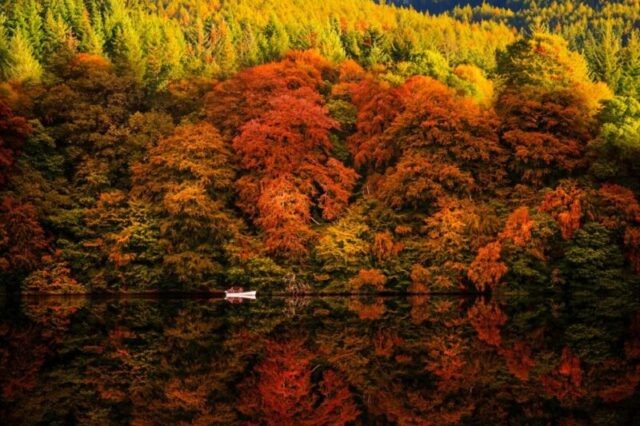 Осенние цвета отражаются в воде озера Фаскалли в Питлохри, Шотландия. Shutterstock