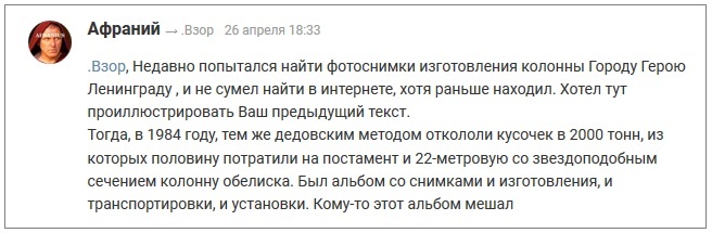 Продолжу, благодаря Афранию, тему невозможности воздвижения гранитных монументов в наше время.