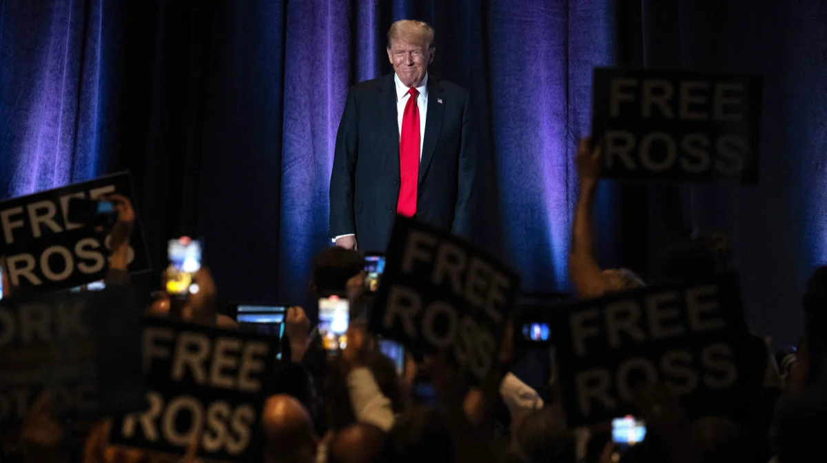 Члены Либертарианской партии требуют освобождения Росса Ульбрихта во время национального съезда партии в Washington Hilton 25 мая 2024.