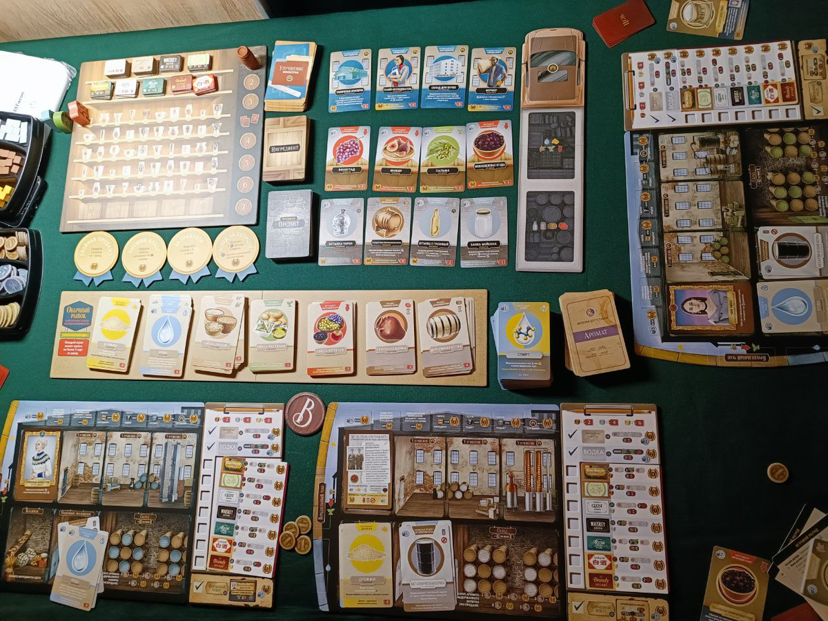 Мы играли втроем, я Женя и Лиза. С Женей в субботу мы разложили игру и сыграли пару раундов. Лизе объяснил правила достаточно быстро, а после первого раунда она отлично со всем разобралась. И очень вовремя взяла специалиста, который дает скидку 2 монеты на рецепты. Тем самым сэкономив очень много денег. А их, как часто бывает в таких играх, всегда не хватает. Я взял карту улучшения, дающую скидку при покупке бутылок. Но это мне не очень помогло. Я не учел, что при подсчете бутылки без региона не учитываются. Женя разогналась ближе к концу партии и смогла накопить много денег. В итоге она выиграла, набрав 77 ПО. Лиза набрала 76, я 68. Это не много, на летсплее у Тимура оба игрока набрали больше 100 ПО, но они играли не в первый раз, поэтому делали это более грамотно.