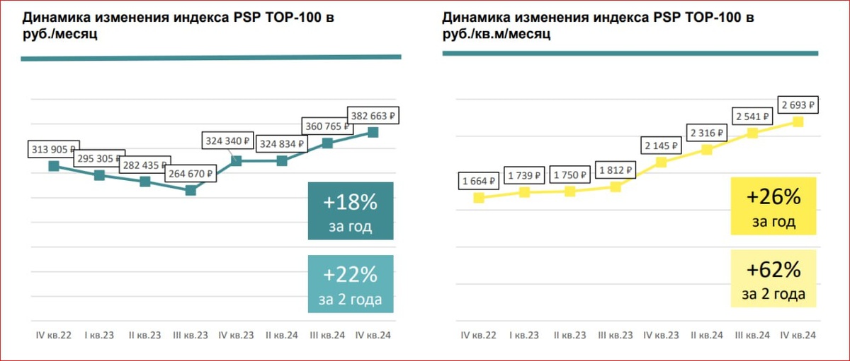 Индекс Prime Saint Petersburg TOP-100 Index (PSP TOP-100) стал больше на 18% по сравнению с прошлым годом. В пересчете на квадратный метр стоимость аренды выросла на 26%, с 2 145 до 2 693 рублей. Средняя площадь таких объектов составляет 161 кв. м, что на 5% меньше, чем годом ранее. Справочно: Индекс формируется на основе средневзвешенной арендной ставки для 100 самых дорогих квартир, доступных для аренды в Петербурге.