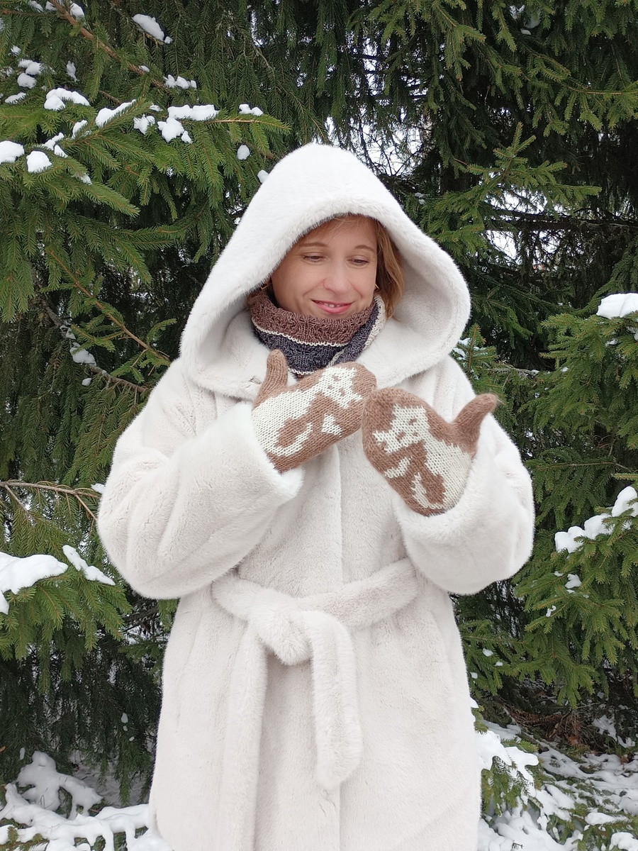 Не зря в народе говорят: "Сапожник без сапог". Вот уже зима на исходе, а я только что связала себе бактус к шубке, которую купила в ноябре. По правде сказать, и зимы-то, собственно, у нас нет. И в этом чувствую есть моя вина 🙈 Это я спугнула зимушку, 💨связав в ноябре теплющие варежки двухсторонним жаккардом 🧶 Дворовые коты хотя впереди ещё нас ждут самые "зимние" март, апрель, май - с вьюгами и снегопадом 🤪 На фото я в той самой шубке, для которой мне срочно надо было связать подходящий комплект аксессуаров. Не люблю когда пряжа кусается, а в контакте со лбом - тем более нужна была самая "беззубая" пряжа 😉 Лана Гатто супер софт 125м/50 г беспроигрышный вариант для шапки. Купила в двух оттенках молочный 10001 и бежевый 14466. Для шапки с жаккардом и для бактуса по остаточному принципу. Набрала 120 петель на спицы 2,5 вязала резинку 1*1 в высоту для нужного мне подворота. Перешла на спицы 3,0 и на этом же количестве петель вязала жаккард по очень простому рисунку: 1 петля бел