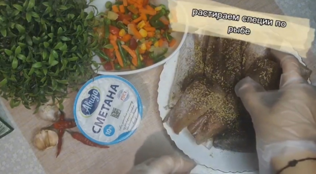 Минтай - 1кг Вода - 150мл Овощи - 200гр Сметана 10% - 170гр Масло растительное - 2ст.л Мука для обвалки Перец черный, соль, специи - по вкусу Рыбу хорошо промыть, обсушить, добавить специи, соль. Оставить на 15 минут. Подготовленные овощи обжариваем на масле до полуготовности с небольшим количеством масла. Снимаем овощи с огня. Рыбу отправляем на сковороду и обжариваем до золотистой корочки с двух сторон. В сметану добавить зелень, чеснок, вместе с овощами добавляем к рыбе. Заливаем стаканом воды и накрываем крышкой. Оставляем тушиться до готовности. Перед подачей можно украсить зеленью. Приятного аппетита!
