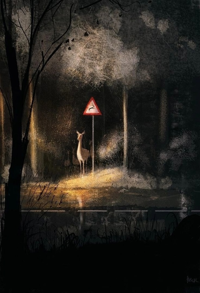 Какой волшебный лунный свет изображен, как красиво он рассыпается на мелкие зернышки! И олень такой же трепетный и невесомый, как этот лунный свет. За ним, кстати, целое семейство следует, и олени, прячущиеся в тени, похожи на призраков. Только человеческий дорожный знак возвращает нас в реальность. «Бэмби?»