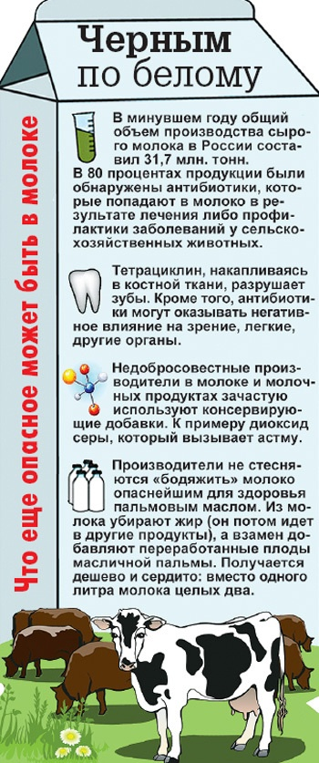 Вы когда-нибудь задумывались о том, что содержит в себе белая жидкость в бутылках на прилавках магазинов с надписью: "Молоко"? Если нет, то сейчас я вам расскажу. Лишь немногие эксперты и люди, имеющие отношение к производству молока, знают, что на самом деле продаётся под видом якобы натурального коровьего молока. Например, что магазинное молоко содержит кровь, гной и антибиотики. А попадает всё это в молоко потому, что почти все коровы болеют маститом. По стандартам молоко не должно содержать более 200 тысяч бактерий на кубический сантиметр. То есть продавать молоко с гноем и разливать его в тару позволяют официальные нормы. По нормам технического регламента, в молоке допустимо до одного миллиона соматических клеток (кровь, гной). Если корова болеет маститом, ей вкалывают антибиотики. А болеют все коровы. То есть всё молоко содержит антибиотики. Именно поэтому молоко и молочные продукты провоцируют развитие аллергий, заболеваний органов ЖКТ, аутоиммунный сбой и даже генетические мута