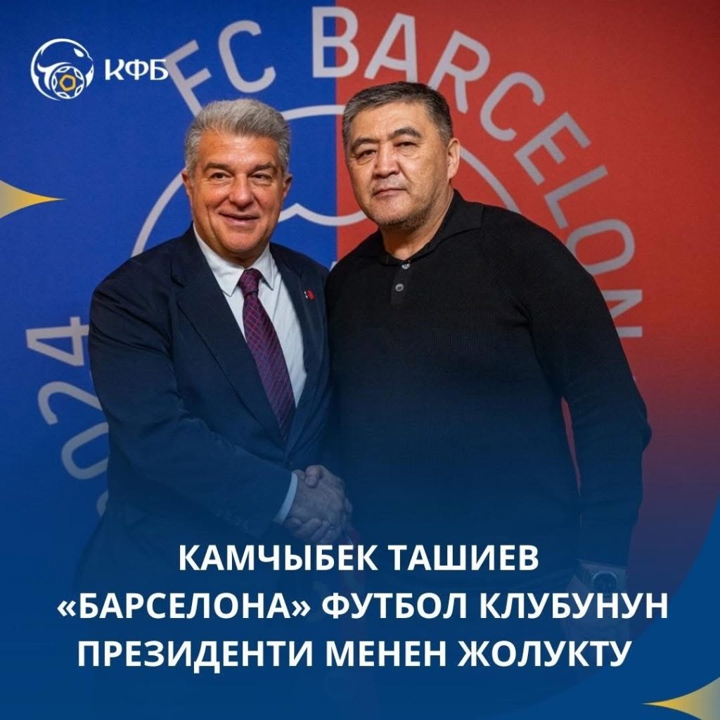 Кыргызстандын футбол федерациясынын президенти Камчыбек Ташиев Испанияда "Барселонанын" президенти Жоан Лапорта менен жолугушту. Кызматташтык маселелери, анын ичинде кыргызстандык оюнчуларды Ла Масиа академиясына кабыл алуу жана машыктыруучуларды даярдоо маселелери талкууланды. Иш сапардын алкагында Кыргызстандын 20 жашка чейинки жаштар курамасы Барселона командасы менен беттешет. ⚽ Кыргызстандын футбол федерациясынын президенти Камчыбек Ташиев Испанияга иш сапары менен барып, Барселона менен кызматташууну талкуулады. 🤝 Клубдун президенти Жоан Лапорта менен жолугушууда кыргыз таланттарын Ла Масиа академиясына кабыл алуу мүмкүнчүлүктөрү талкууланды. 🏆 Ошондой эле Кыргызстандын футбол адистерине машыктыруучуларды даярдоо жана семинарларды өткөрүү тууралуу сүйлөштүк. 📅 Сапардын алкагында Кыргызстандын 20 жашка чейинки жаштар курамасы клубдун академиялык стадионунда Барселонанын жаштар командасы менен беттешет. 🇰🇬 Бул беттеш Кыргызстан курамасынын Азия Кубогуна даярдануусунун маанилүү