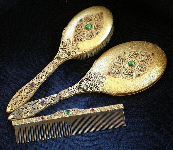 Позолоченное серебро чистится особо аккуратно. для очистки щетины Мэри заваривает кипятком отруби и протирает ими свиную щетину. Надо быть внимательной, чтобы резные ручки не запачкались. Ими же чистится и черепаховый панцирь, из которого сделан гребень. Осталось только протереть всё фланелью и заняться менее пафосными щётками юных мисс.