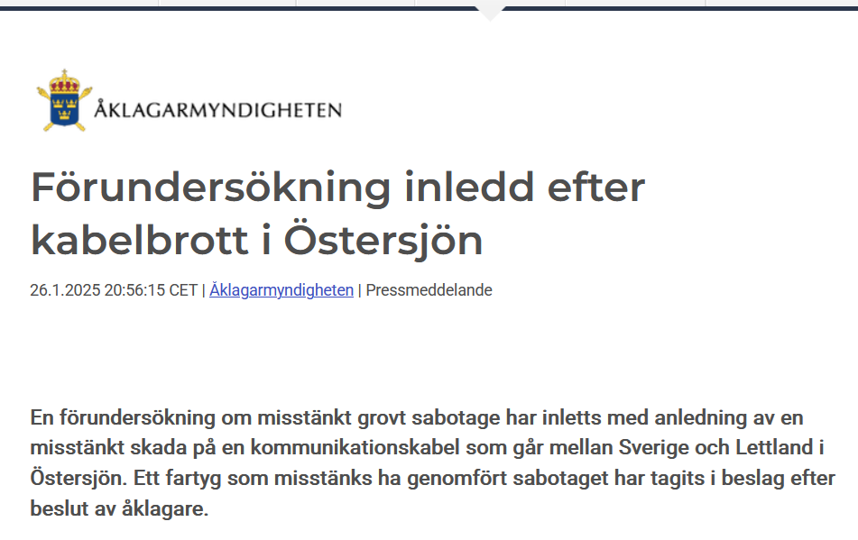 Когда в новостях пишут - в Швеции задержали, мол, то судно, что повредило кабель - сразу открываешь всё подряд, чтобы узнать, наше или китайское. Третьего, как известно, не дано. Но все пишут просто "захватили". Дальше тишина. И начинаешь поневоле раздражаться. Не знаете - так молчите. На всякий пожарный ищу шведские и близкие им источники. И вот, что там пишут: "Предварительное расследование по подозрению в крупной диверсии начато в связи с предполагаемым повреждением кабеля передачи данных между Латвией и островом Готланд в Балтийском море, говорится в пресс-релизе прокуратуры Швеции. Судно, подозреваемое в совершении диверсии, захвачено. "Я могу заявить, что шведские власти в настоящее время интенсивно и совместно работают над расследованием этого инцидента", - говорится в заявлении старшего прокурора Матса Юнгквиста". Всё. Точка. Загадка однако... Открываю другое. "Расследование по подозрению в диверсии было начато в связи с предполагаемым повреждением коммуникационного к