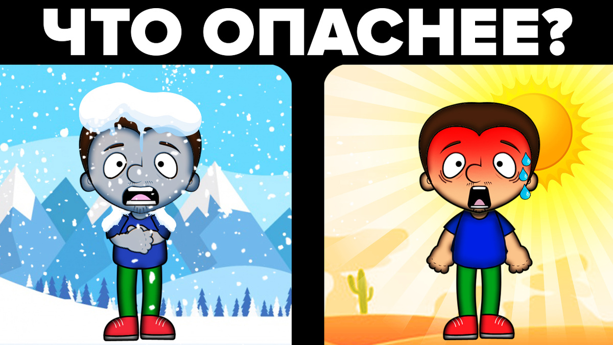 Привет, друзья! Сегодня мы выясним, что опаснее: оказаться на морозе или застрять в самой горячей пустыне в мире? Что быстрее убивает и как, экстремальный холод или запредельная жара? Поехали! Начнём с холода, а для этого переместимся на южный полюс. Температура воздуха здесь может опускаться до -58 градусов по Цельсию. Пока что вы лишь наслаждаетесь свежим морозным воздухом, потому что в таком воздухе на 30% больше кислорода, чем в тёплом. Однако через 45 минут температура тела снижается до 35 градусов, вас начинает трясти от холода - это мозг заставляет сокращаться мышцы, чтобы выработать тепло и согреть тело. И это помогает! Но радоваться рано. Это ненадолго. Когда температура тела падает до 34 градусов, Вы начинаете теряет память и рассудок. Ниже 32 градусов наступает крайнее переохлаждение. Мозг не тупой, и отдает приказ снабжать кровью себя и другие жизненно важные органы, обделяя при этом конечности. Поэтому они отмораживаются в первую очередь. Но этого недостаточно, кровь уже с