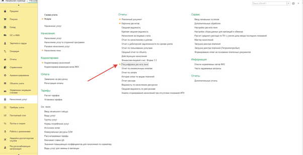 Расчёт пени производится в отчёте «Расшифровка расчёта пени». Он находится в разделе «Начисление услуг» — «Отчёты».