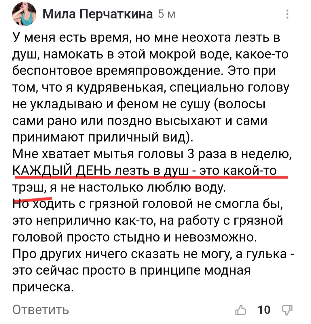 Внимание, особо брезгливым просьба дальше не читать: от некоторых комментариев буквально пахнет двухнедельным потом и немытой сальной головой. Кому-то, оказывается, противно ощущение мокрой воды на теле, лучше, наверное ходить плохо пахнущей, но всегда сухой (шутка). В одной из статей была затронута тема мытья волос - как часто это лучше делать. Большинство девушек написали, что моют голову раз в день или через день, но немало отозвалось и тех, кто делает это куда реже. Наталья справедливо пишет, что раньше мало у кого дома был фен, и помыть голову перед работой было почти нереально. Но сегодня, когда фены естьина любой вкус и кошелёк- от 500 рублей до стоимости машины сушка волос не вызывает никаких проблем. Но тем не менее, кто-то по-прежнему моет волосы раз в неделю. Никогда не задумывалась о том, что блондинка мыть нельзя чаще, чем раз в неделю. У меня в жизни был недолгий период, когда я ответила волосы, но на частоте мытья этого как не сказалось. Чтобы тон волос не желтел просто