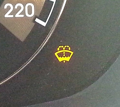 Не пугайтесь. Данный значок обозначает, что в автомобиле закончилась жидкость стеклоомывателя. Восполнить её не составит труда. Для этого откройте капот автомобиля и найдите под ним бачок стеклоомывателя. Как правило на крышке бачка имеется такой же рисунок как и на приборной панели (жёлтый значок который загорелся). Крышка у бачка может быть светлого или тёмного цвета. Откройте крышку и залейте жидкость до отметки, после чего закройте крышку и капот. Однако, если бачок омывателя полный, а знак на панеле горит, то возможно, проблема в датчике. Поэтому нужно обратиться в автосервис