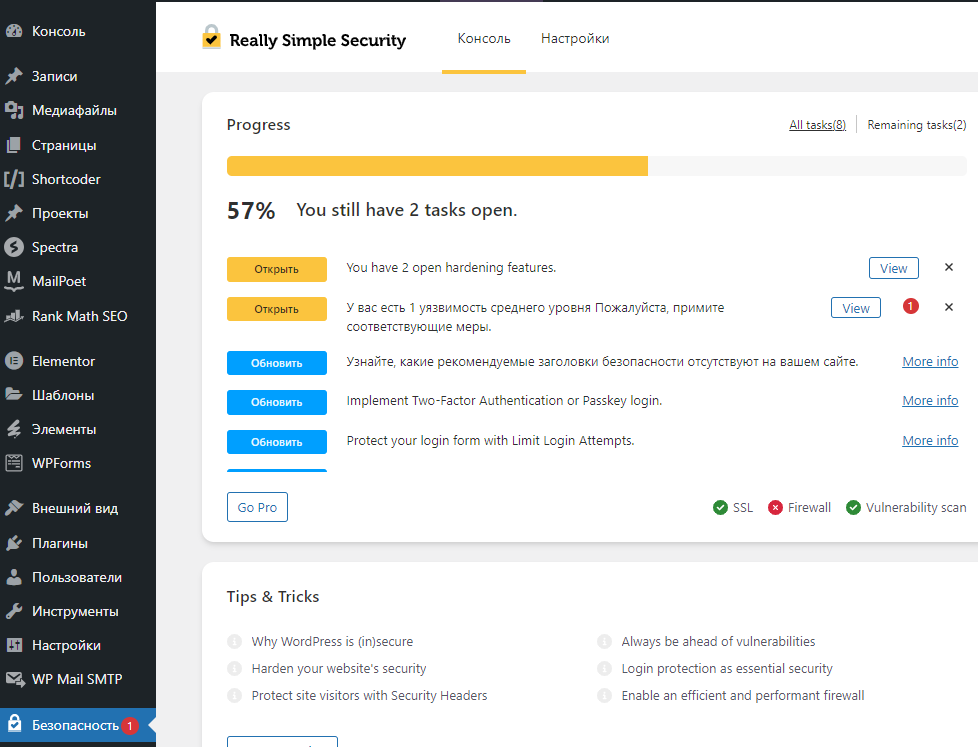 Который "улучшает безопасность сайта с помощью упрочнения WordPress, двухфакторной аутентификации (2FA), защиты входа в систему, обнаружения уязвимости и генерации сертификатов SSL" И он обнаружил уязвимость и выводит предупреждение: "У вас есть 1 уязвимость среднего уровня Пожалуйста, примите соответствующие меры."