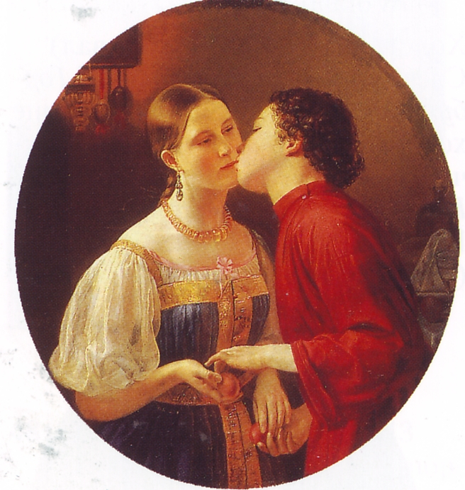Поцелуй чистейший и нежнейший. Поцелуй как знак любви к человеку вообще, а не любви конкретного юноши к конкретной девушке. И девушка такая хорошая, скромная, целомудренная, и юноша прелестный, в нарядной красной рубашке. А на девушке симпатичные серьги и ожерелье на стройной шейке. С праздником, дорогие читатели!