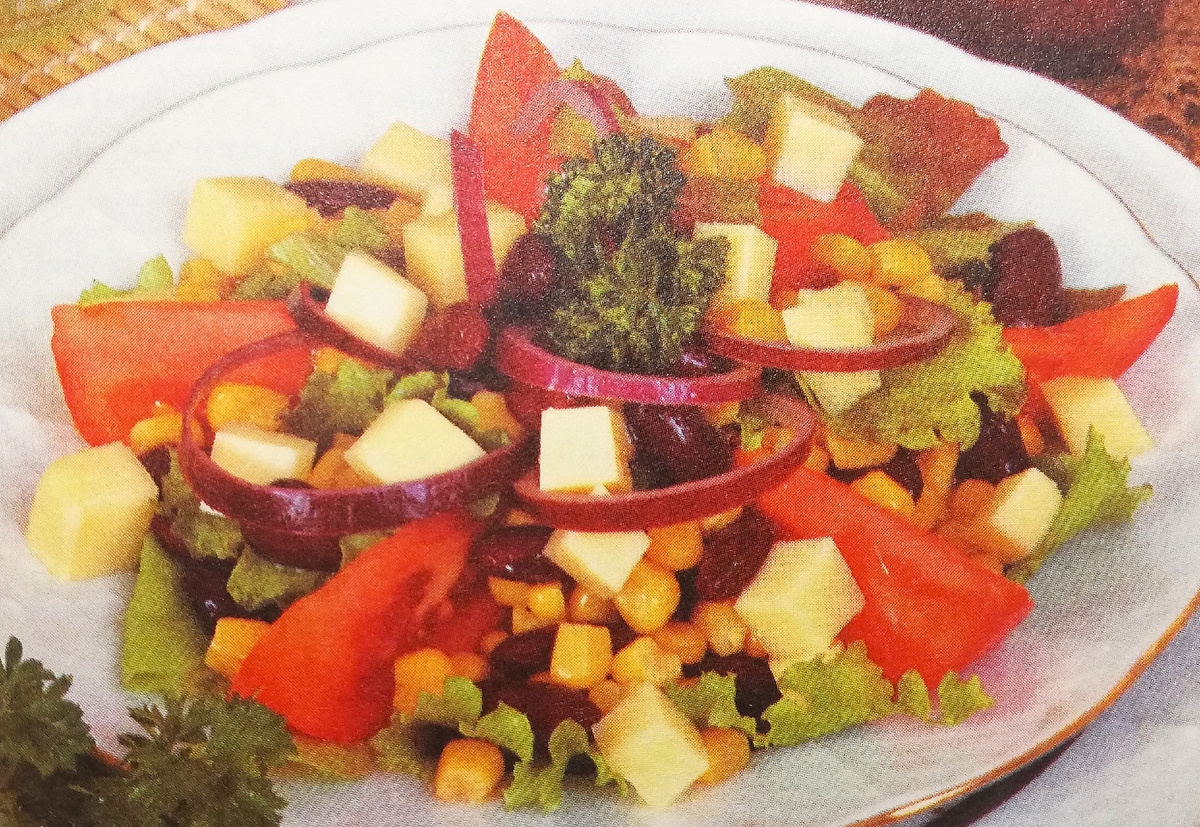 Ингредиенты: - 3 помидора - 1 красная луковица - 150 г консервированной кукурузы - 150 г консервированной красной фасоли - 100 г нежирного сыра - 1 пучок зеленого салата - 0,5 пучка зелени петрушки - 2 ст. л. оливкового масла - 1-2 ч. л. яблочного уксуса - соль, перец по вкусу Приготовление: Помидоры помыть, порезать на ломтики. Очистить лук, промыть его и нарезать кольцами, затем полить уксусом. Салатные листья также нужно тщательно помыть, высушить и разложить по тарелкам. Петрушку тоже следует помыть. Нарезанный небольшими кусочками сыр смешивают с фасолью и кукурузой, добавляют соль и перец, а затем выкладывают смесь на салатные листья вместе с ломтиками помидора. Сверху кладут кольца лука и слегка сбрызгивают оливковым маслом. В завершение украсить салат веточками петрушки и подавать на стол.