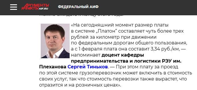 Член Общественного совета при Ространснадзоре Сергей Тиньков о росте цен в системе «Платон». Аргументы и факты, 24.01.25
