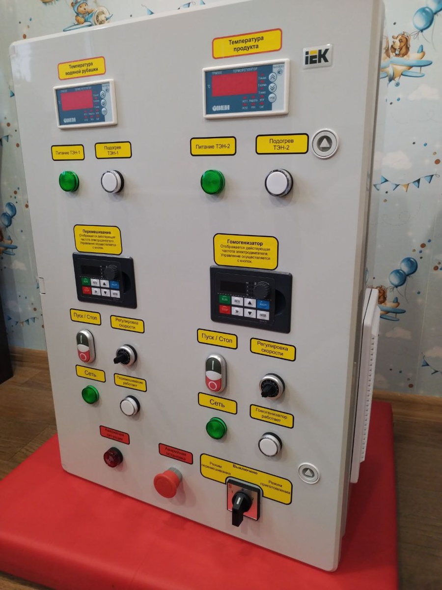 Номинальная мощность 21кВт. Частотные преобразователи выполняют следующие задачи: 1) управление оборотами гомогенизатора (тщательное и мелкое перемешивание) 2) перемешивание (общее перемешивание приготавливаемой массы для однородности). Один контроллер управляет температурой продукта, второй - температурой водяной рубашки. Коммутации происходят через твердотельные реле с радиаторами. Работайте с профессионалами!