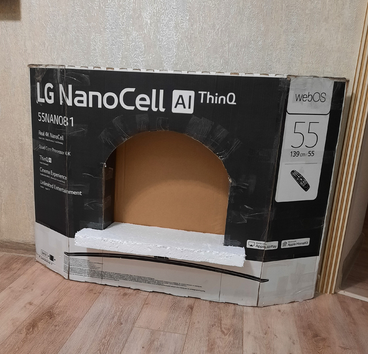 Иметь дома камин – мечта, однако не все эту мечту могут себе позволить. Установка настоящего дровяного камина в квартире невозможна по соображениям пожаробезопасности, можно конечно приобрести био или электрокамин, но это недешевое удовольствие. Я решила не приобретать, а сделать фальш-камин самостоятельно. Возник вопрос – из чего сделать фальш-камин? В ход могут пойти абсолютно любые материалы, которые есть под рукой, у меня имелась коробка из под телевизора. Из нее я сконструировала детали камина и склеила конструкцию скотчем. Зону под очаг вырезала полукругом и установила полочку из пенопласта. Из картонных коробок вырезала «кирпичики» и с использованием клеевого пистолета облицевала ими всю заготовку. В наличие имелся небольшой кусок гипсокортона из которого я смастерила верхнюю крышку-полку. Для придания объема облицевала верх и низ камина потолочным плинтусом. Ну и в завершение покрыла всю конструкцию белой водоэмульсионной краской. В "топку" уложила березовые поленья. Для подс