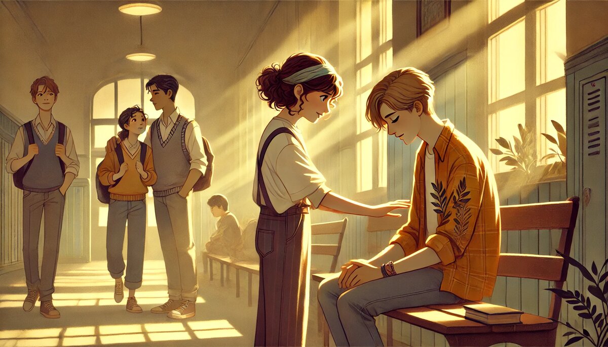 Когда Даша приблизилась, друзья чуть расступились, и она увидела Рому. Он стоял в стороне и выглядел смущённым. Когда их взгляды встретились, он нерешительно улыбнулся, но всё же казался спокойнее, чем вчера.