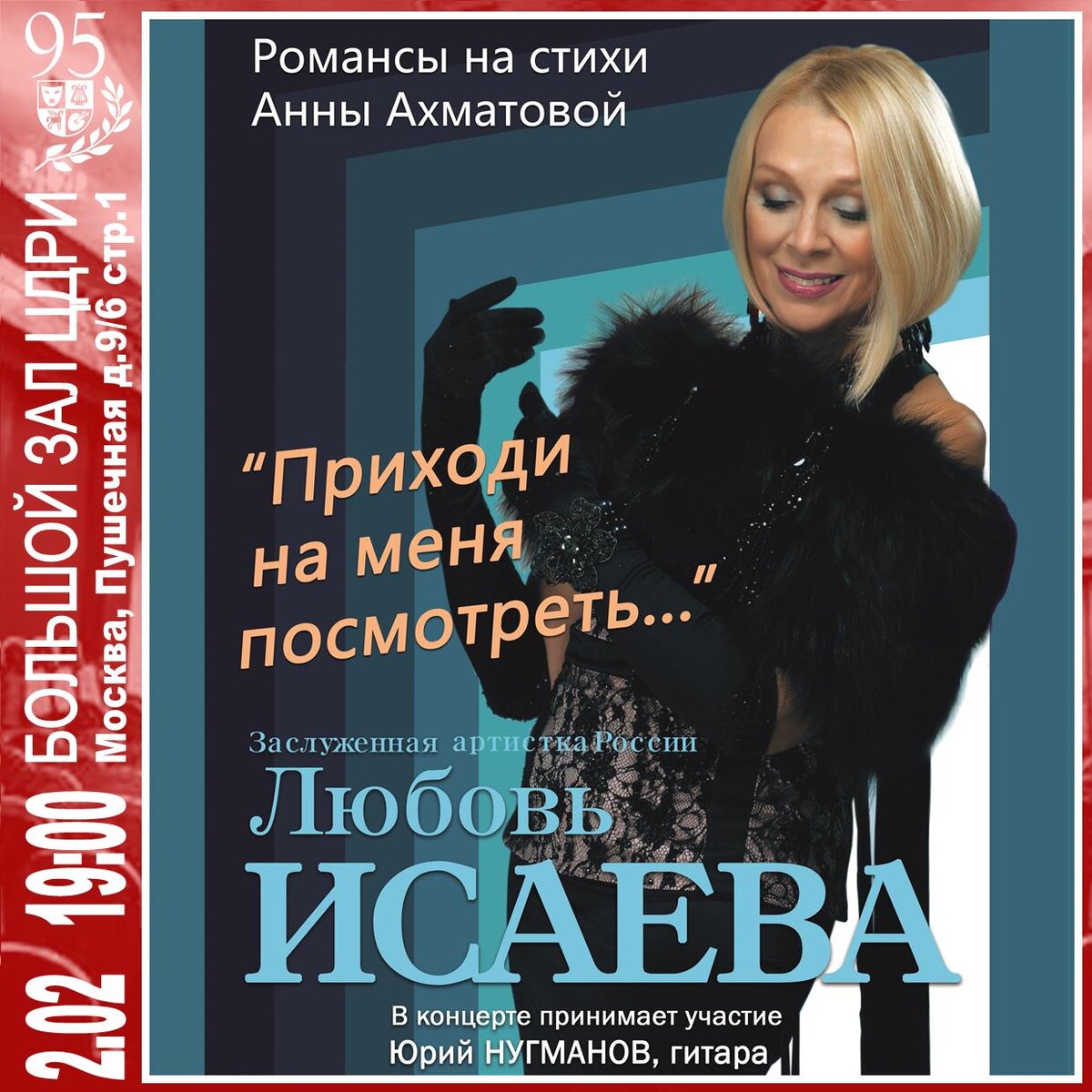 Романсы на стихи Анны Ахматовой Авторская программа концерта посвящена творчеству известной русской поэтессы Анны Ахматовой. В первом отделении концерта прозвучат стихи А. Ахматовой, а также романсы на стихи А. Ахматовой, специально написанные для этой программы. Во втором отделении концерта прозвучат старинные русские романсы. Заслуженная артистка России — Любовь Исаева В концерте принимает участие известный гитарист, солист Москонцерта — Юрий Нугманов или в кассе ЦДРИ: г. Москва, ул. Пушечная 9/6 стр.1