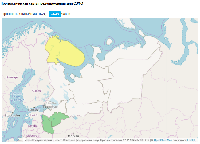 В Петербурге 27 января ожидаются осадки, северных районах в виде дождя и мокрого снега, предупредил главный синоптик города. В Северной столице продолжается аномальная оттепель "Циклон проходит прямо через Ленинградскую область, вынося новые порции дождя и тёплого воздуха. В течение сегодняшнего дня температура воздуха в Санкт-Петербурге будет оставаться положительной +1…+2 градуса", — написал Колесов. Синоптик констатировал, что это "мало подходит для торжественных мероприятий проводимых сегодня в городе". "Такая погода очень похожа на погоду, установившуюся в Ленинграде в конце января 1944 года, как раз в самые решающие дни прорыва блокады", — добавил Колесов. В Гидрометцентре на момент написания заметки ненастья и предупреждений не объявляли. Согласно прогнозу погодного центра "Фобос", в понедельник ожидается переменная облачность, сильный снег, сильный туман, +1..+3 градуса, ветер слабый. Снег ожидается и вечером, ночью местами дымка. Во вторник переменная облачность, небольшой дож