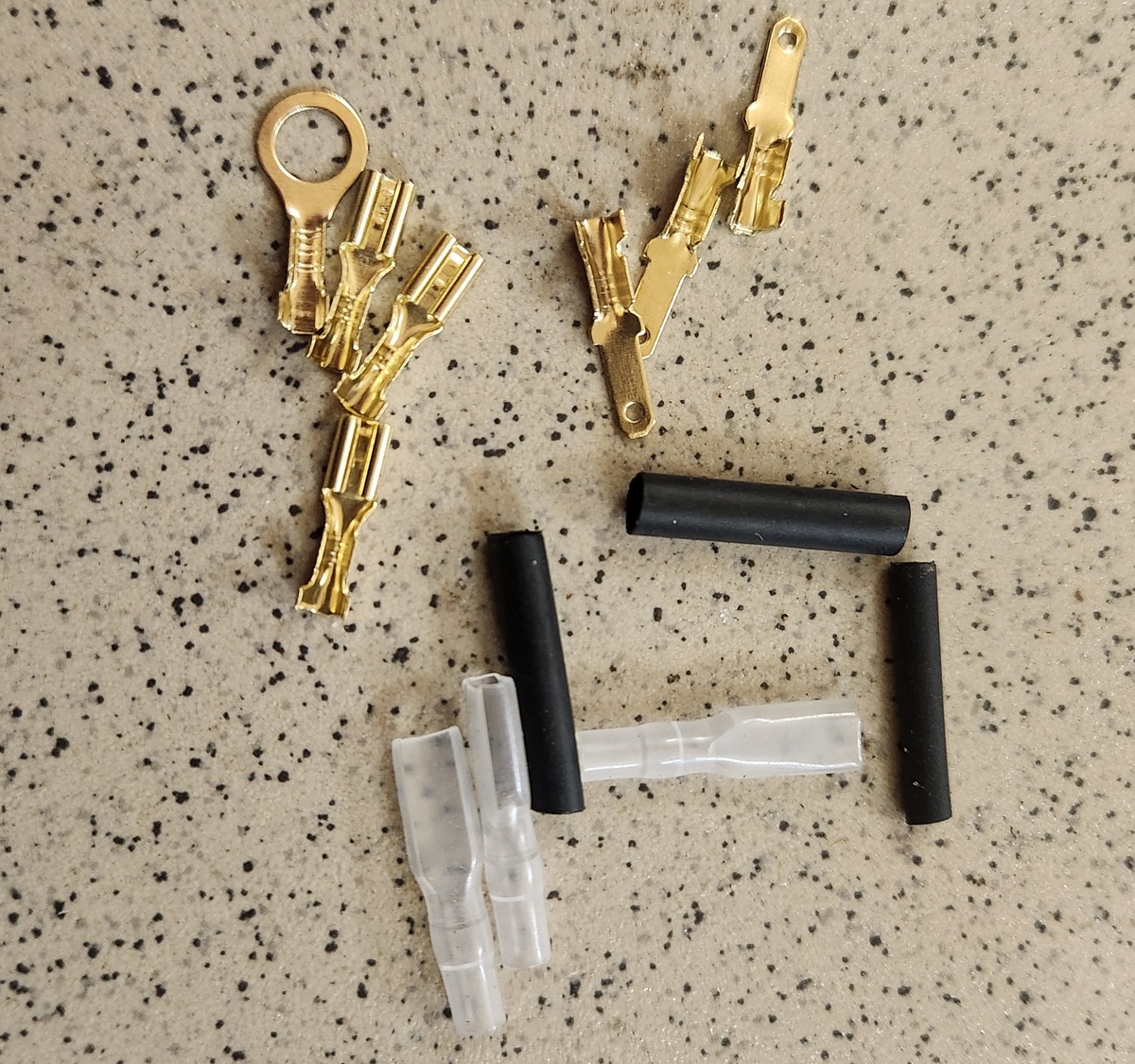 Я не претендую на лавры механика или автоэлектрика, т.к. по хорошему фару нужно запитывать от генератора, что возможно потребует включение в цепь дополнительных реле, и прочего... Но не об этом сейчас Хочу рассказать самым простым и доступным способом: как подключить фару на питбайк, у которого, та самая фара, включая проводку под нее, отсутствуют с завода. Наша фара будет иметь 2 режима (включение и выключение) c кнопки, и работать только с включенным зажиганием. Для этого нам потребуется 2 провода по 20см с сечением 0,8-1мм, 1 клемма на массу, 3 набора клемм папа-мама, термоусадка, изолента. Так же была куплена светодиодная фара в комплекте с крепежом (см фото) и кнопка, имеющая 2 положения (вкл и выкл). Ссылки на них давать не буду, все покупалось в маркетплейсе Абсолютно все провода в нашем комплекте на установку имеют свободные концы, поэтому установим на них клеммы, на случай если в дальнейшем потребуется снятие фары, например для обслуживания узлов вилки: Вот что у нас получает