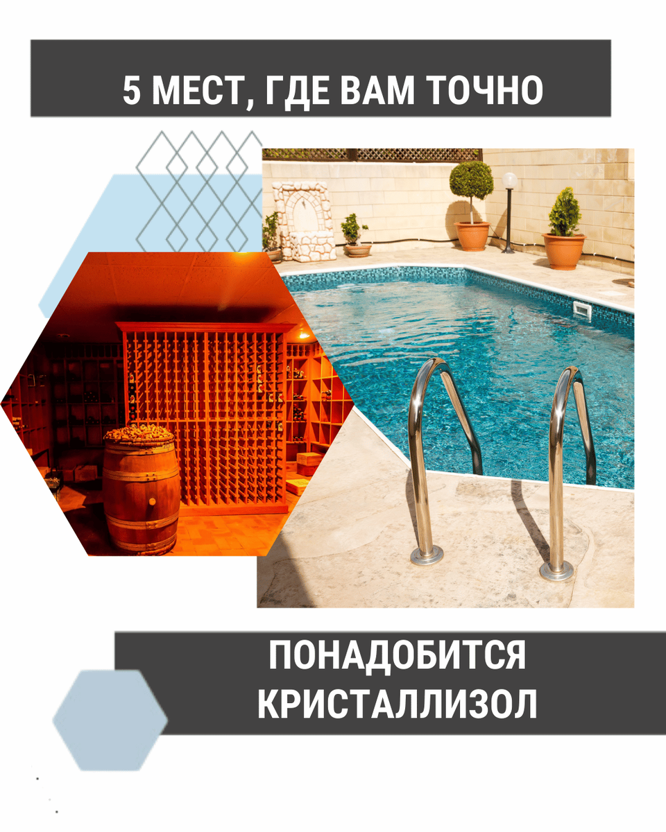 При строительстве или ремонте купелей и бассейнов особенно важно обеспечить герметичность. Кристаллизол эффективно справляется с этой задачей. Он создает прочную защиту, которую не смоет даже интенсивное использование. - Мокрые зоны