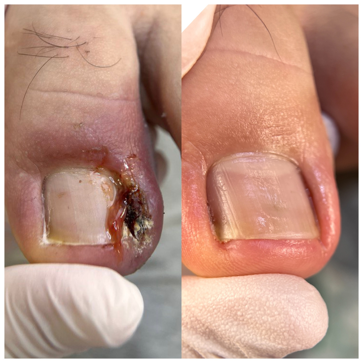 Работа с таким состоянием требует особенного подхода и определенных усилий! Особенно когда дело касается ног! Ведь мы на ногах ходим ежедневно! Можно на одну минуту представить какую боль доставляет такой палец с отеком, грануляцией и воспалением. Часто к нам обращаются уже с хроническим состоянием как на фото! А все почему? Каждый раз на приеме слушая клиента, история начинается у всех приблизительно одинаково. Сначала клиент пытался справиться самостоятельно, и раз за разом выстригал этот злосчастный ноготь! И постепенно приводил состояние ногтя в точку невозврата для себя самого. От неправильного подстригания, стенка ногтя уходила все глубже и глубже, а учитывая сильное потоотделение и отсутствие гигиены стоп, а в последующем и развитие инфекции привело к такому состоянию. Так что же нужно сделать первостепенно? 1. Остановиться и перестать себе вредить 2. Обратиться к нам за профессиональной помощью Как мы решаем такую проблему? На первом же визите вы почувствуете к