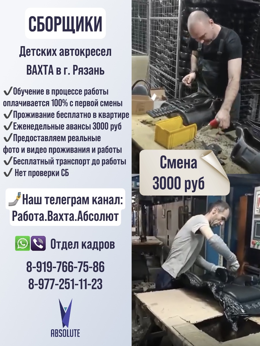 ✅ 1 вакантное место - на производство по изготовлению детских автокресел. Вахта в г. Рязань. Контакты: ☎️ 89197667586 (WhatsApp) http://wa.me/79197667586 ☎️ 89772511123 (WhatsApp) http://wa.me/79772511123 ПОДПИШИСЬ ✅ 🤳🏽 https://t.me/vahta_ok Наш Телеграм канал с видео о работе и отзывами сотрудников: Работа.Вахта.Абсолют