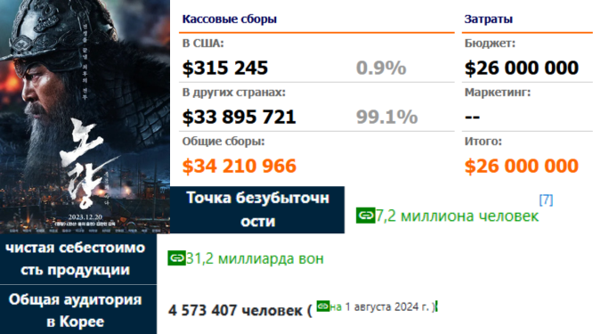 Взяла результаты и посмотрела что в финале, заодно узнала что смотрели активнее всего. Подумала о вечном «Тише едешь — дальше будешь», многие фильмы сюда не попали, потому что шли тихо, мирно, долго и везде, были сняты со скромным бюджетом и в итоге оказались крайне прибыльными. Поспорили мы тут все плохо в большом кино, или нет, цифры все открыты, решила проверить))) Ввод в историю вопроса: корейцы года два точно рыдают над тем что люди перестали ходить в кинотеатры. Фильм вышел в конце декабря 2023, но основные сборы выпали на 2024, так что начнем с него. Очень дорогой фильм, так уже нельзя, поэтому хоть и входит в Топ-10 кассовых фильмов, вышедших в Корее в 2023 году, точку безубыточности при показе в Корее не прошел. Но с учетом мирового проката, прав показа по стримингу и тп, остались в плюсе. Тут все сложно, ибо это вторая часть фильма, который криво пропиарили и он ушел в минус на 1,5 млн... Точку безубыточности второй части не сообщали, так что достоверно неизвестно что там и к