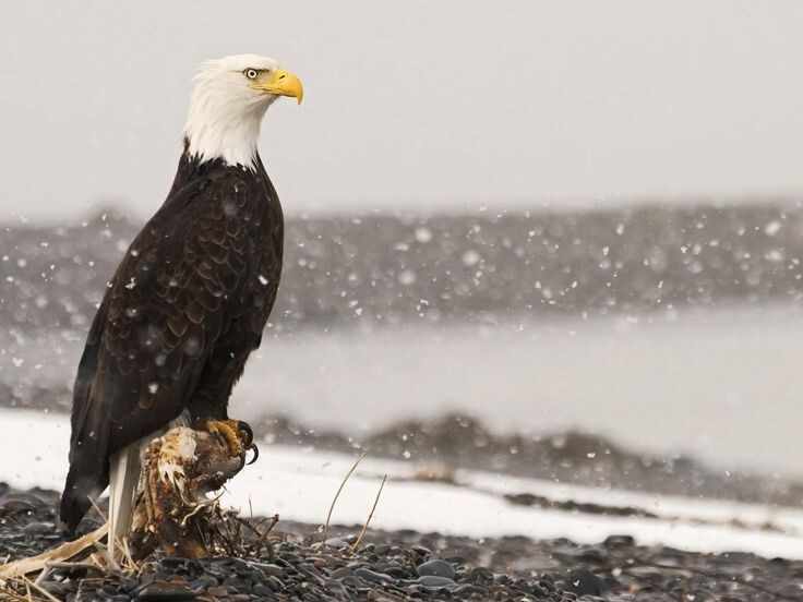 Белоголовый орлан — это крупная птица, достигающая в размахе крыльев до 2,3 метра. Взрослые особи имеют характерное белое оперение на голове и хвосте, в то время как остальное тело покрыто темно-коричневым пером. Глаза желтые, а клюв массивный и белый, что подчеркивает их внушительный вид.