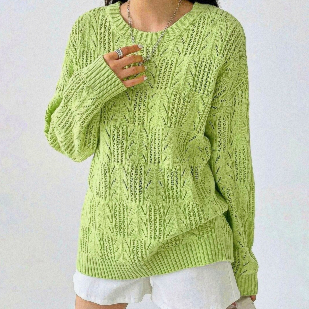 Нежный салатовый пуловер с рельефными узорами. Женская модель свободного кроя, такой простой и элегантный оверсайз идёт женщинам с любыми фигурами и идеально вписывается в любой ансамбль!