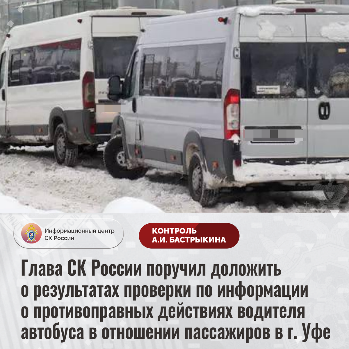 Глава СК России поручил доложить о результатах проверки по информации о противоправных действиях водителя автобуса в отношении пассажиров в г. Уфе В СМИ и социальных сетях сообщается, что 25 января текущего года в городе Уфе Республики Башкортостан водитель автобуса отказался выпустить из транспортного средства школьника, не оплатившего проезд из-за неисправности мобильного телефона. После чего мужчина стал угрожать мальчику вызовом полиции и высадкой из автобуса на ближайшей остановке. Отмечается, что аналогичные действия водитель совершил в отношении заступившейся за подростка пассажирки и ее ребенка. В СУ СК России по Республике Башкортостан организована процессуальная проверка. Председатель Следственного комитета Российской Федерации Александр Иванович Бастрыкин поручил руководителю СУ СК России по Республике Башкортостан Владимиру Владимировичу Архангельскому доложить о промежуточных результатах процессуальной проверки и принятом по итогам решении. Исполнение поручения, а также х