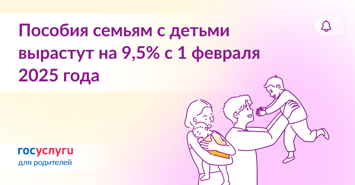 10 000 → 10 950 (+ 950 ₽) Об индексации и размере маткапитала с 1 февраля — в следующих публикациях. Правила и размеры других социальных выплат — в соцсетях Госуслуг. Подпишитесь, чтобы узнавать важное вовремя. @gosuslugiforparents