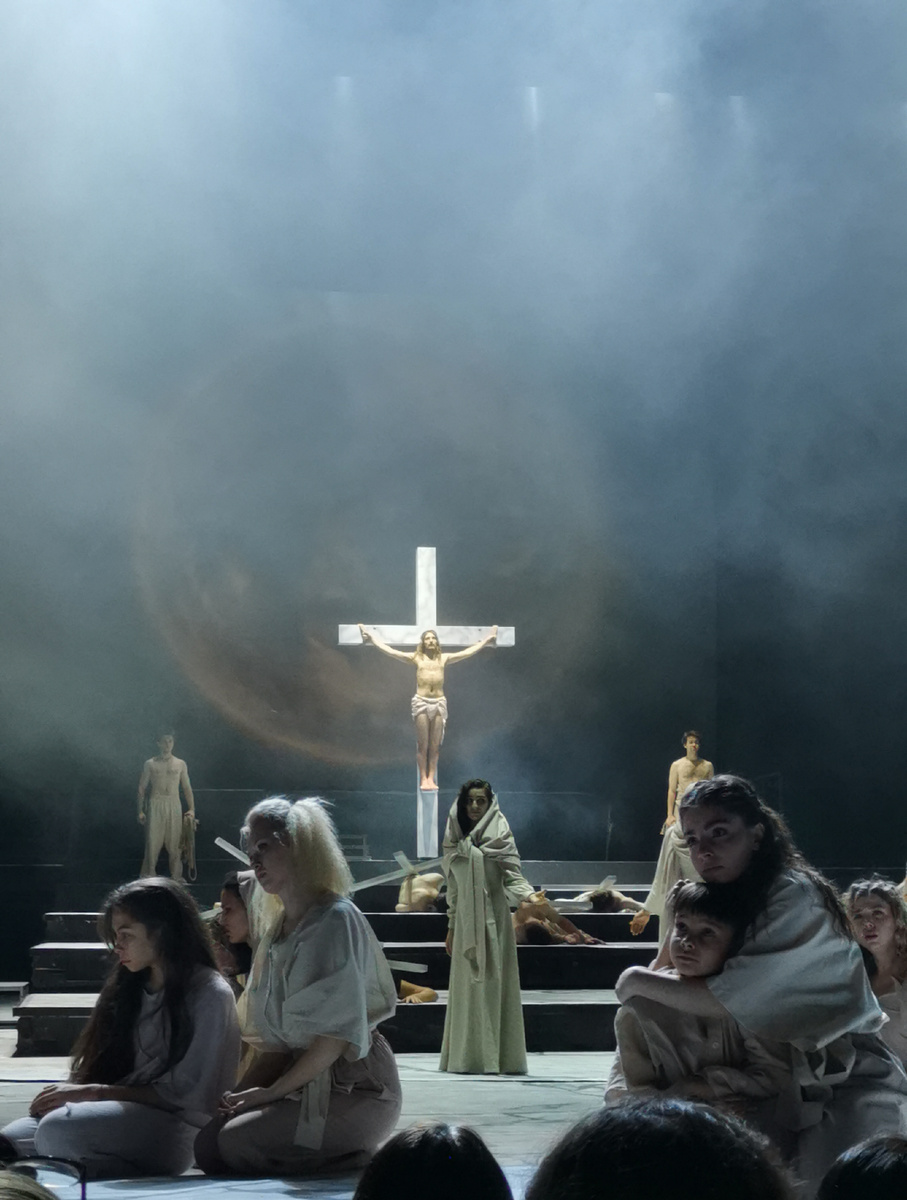 Роман Булгакова "Мастер и Маргарита" вещь многослойная. При чтении видно тесное переплетение двух разных историй. Режиссёры, пытающиеся визуализировать происходящее, понимают, что полностью погрузить зрителя в паутину действия не получится, а потому акцентируют внимание на том, что им ближе. Кто-то выводит на первое место взаимоотношения Мастера и Маргариты, кто-то линию Воланда с его свитой. Но вот отдельно взятой линии романа Мастера с его около библейским сюжетом, как это сделал режиссёр Александр Лазарев на сцене Центрального Академического Театра Российской Армии, до этого я не встречала. Прологом идёт финальная сцена Бала в нехорошей квартире. И гигантской сцене театра Армии очень идут слова Маргариты: "Меня поражает то, где всё это помещается". Пространство тянет на пятое измерение, тем более, что почти сразу произойдёт смещение во времени, и мы окажемся в Ершалаиме ранним утром четырнадцатого числа весеннего месяца нисана. Очень подробная история Пилата. В спектакле именно он