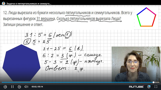 Эта статья посвящена двум публикациям в Интернете, связанным с решением уравнений в натуральных числах, обходящихся совсем без математической теории. К задаче Л. Ф. Магницкого мы ещё вернёмся, а начать надо с задачи из ВПР для 4 класса по математике, опубликованной 15 апреля 2023 года. 1. Люда вырезала из бумаги несколько пятиугольников и семиугольников. Всего у вырезанных фигурок 31 вершина. Сколько пятиугольников вырезала Люда? Запиши решение и ответ. Решение подробно разъяснено. Его можно прослушать по ссылке: https://ya.ru/video/preview/11425576963181089541 Детям предлагается разделить число вершин на меньшее число углов в фигуре — на 5. Получается 6 и в остатке 1, то есть 6 пятиугольников и одна лишняя вершина, с помощью которой из пятиугольника не образуешь семиугольник. Возьмём меньше пятиугольников — 5. У них 25 вершин, осталось 31 – 25 = 6 вершин. Следующее действие не записано: 7 – 5 = 2 (верш.) надо добавить, чтобы из пятиугольника получить семиугольник. Получится 6 : 2 = 3