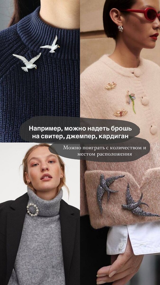 Примеры в картинках вы найдёте в конце статьи. Как стилизуем: - рисуем картины или историю на одежде или просто нацепляем всё и сразу, как кому нравится (можно разместить на вязаных вещах, так меньше всего повреждается ткань!) - используем не только броши, но и другие украшения, например серьги (привела примеры в карусели 🙌) - играем в минимализм, используя одну заметную брошь - по классике, располагаем броши на лацканах жакетов или пальто, также интересным местом может выступать горло свитера, шарф или сумка - декорируем пуговицы жилетов, жакетов, пальто - выглядит очень свежо и нетривиально (особенно классно работают крупные броши разных форм) - драпируем изделия, создаём необычные линии, выделяем талию или делаем акцент в образе (тут вообще всё ограничивается лишь ваш