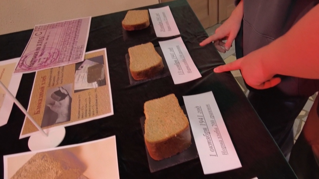 Траурные мероприятия проходят во всех городах региона. Главный символ блокадного Ленинграда — 125 граммов хлеба — дневная норма, которая полагалась каждому жителю осажденного города. Мирослава Волкова признается: сегодня впервые серьезно задумалась о том, что пережили люди. Впечатление на школьницу произвели отрывки из писем-воспоминаний ее сверстников. «Привлекли внимание надписи, как уменьшался хлеб за месяц. Папа рассказывал про блокаду Ленинграда, про Великую Отечественную войну, про хлеб, про карточки, как люди могли украсть их», — говорит Мирослава Волкова, участница акции «Блокадный хлеб». Об одной из самых страшных страниц отечественной истории вспоминают и в центральной библиотеке. Здесь на постоянной выставке собраны вещи в том числе блокадников. Экспозицию хранители фондов собирали буквально по крупицам, попутно записывая воспоминания всех, кто пережил 40-е годы прошлого века. «Я не видела таких, кто сказал бы, что не хочет этого слушать и ему это неинтересно. Приятно, что д