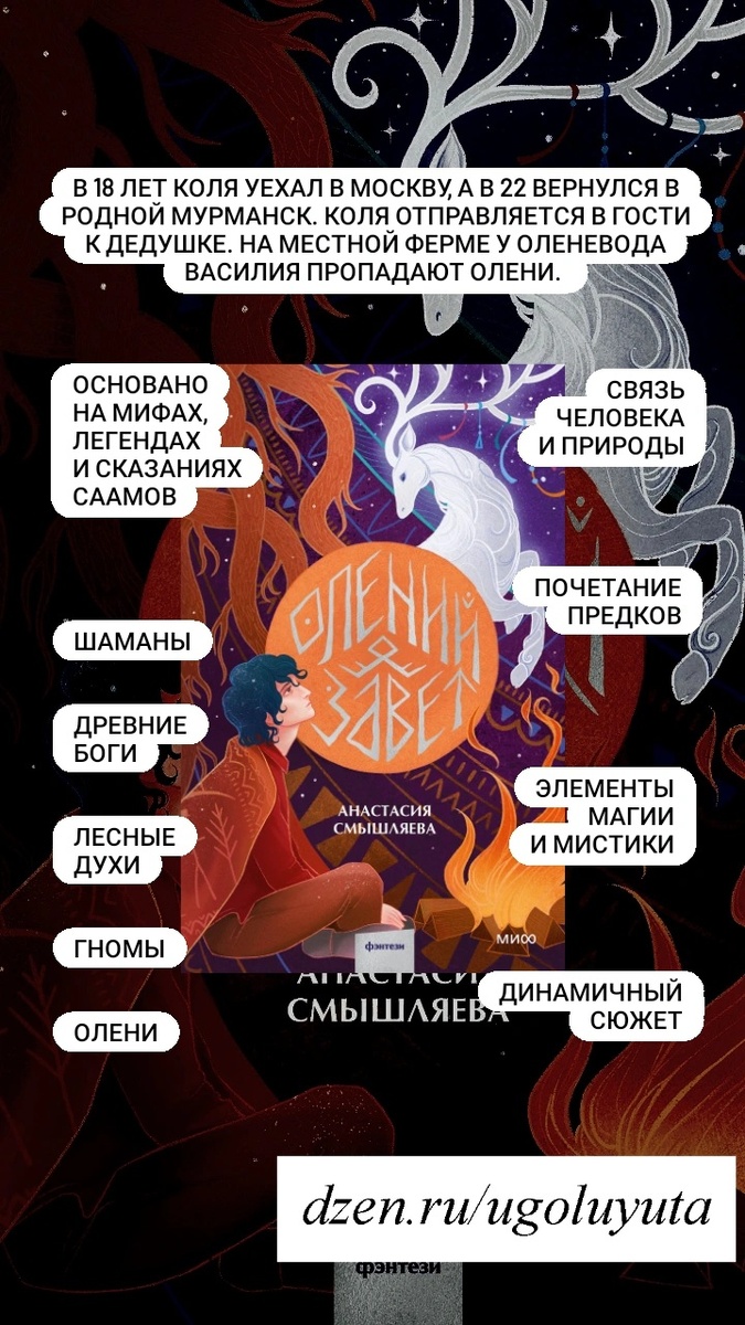 Прочитала "Олений завет" (до этого из этой серии читала "Солнце в силках", очень понравилось, хочу прочитать всю серию). Эта книга основана на саамских легендах и сказаниях. Главный герой - городской молодой человек, который столкнулся с неожиданным для себя миром.