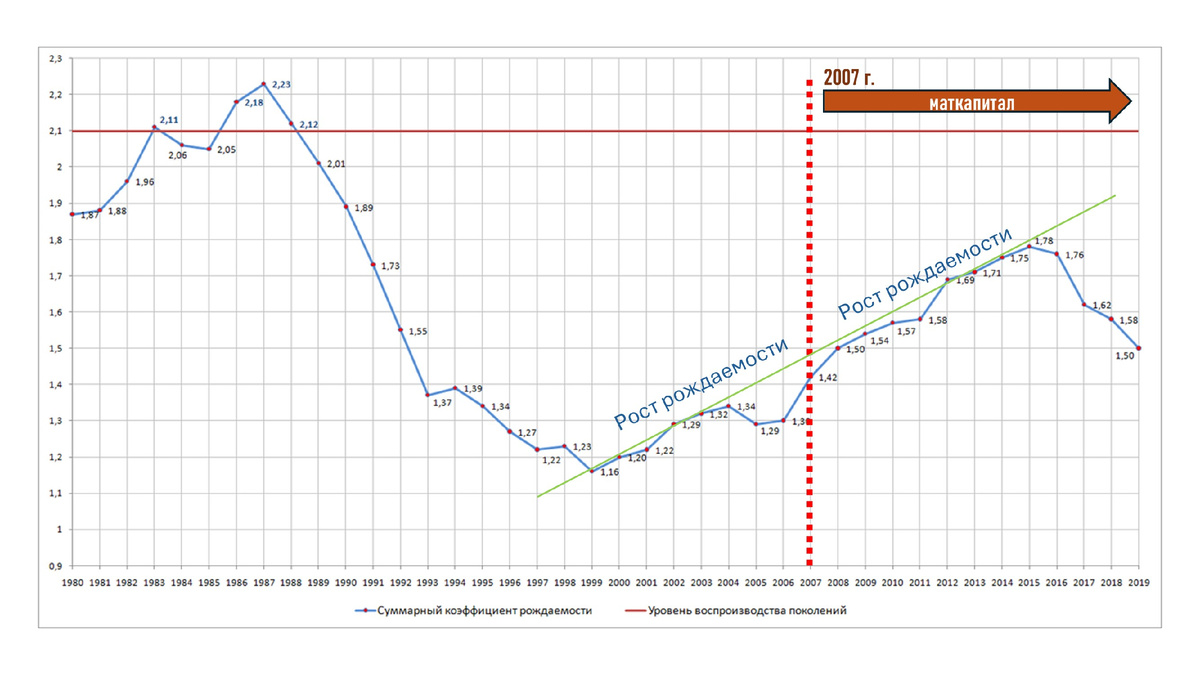 В 2007 году для повышения рождаемости ввели маткапитал (пособия) и – «Благодаря маткапиталу в России родилось на 2-2,5 млн детей больше (за время действия программы)». Ой ли? Смотрим на график суммарного коэффициента рождаемости.