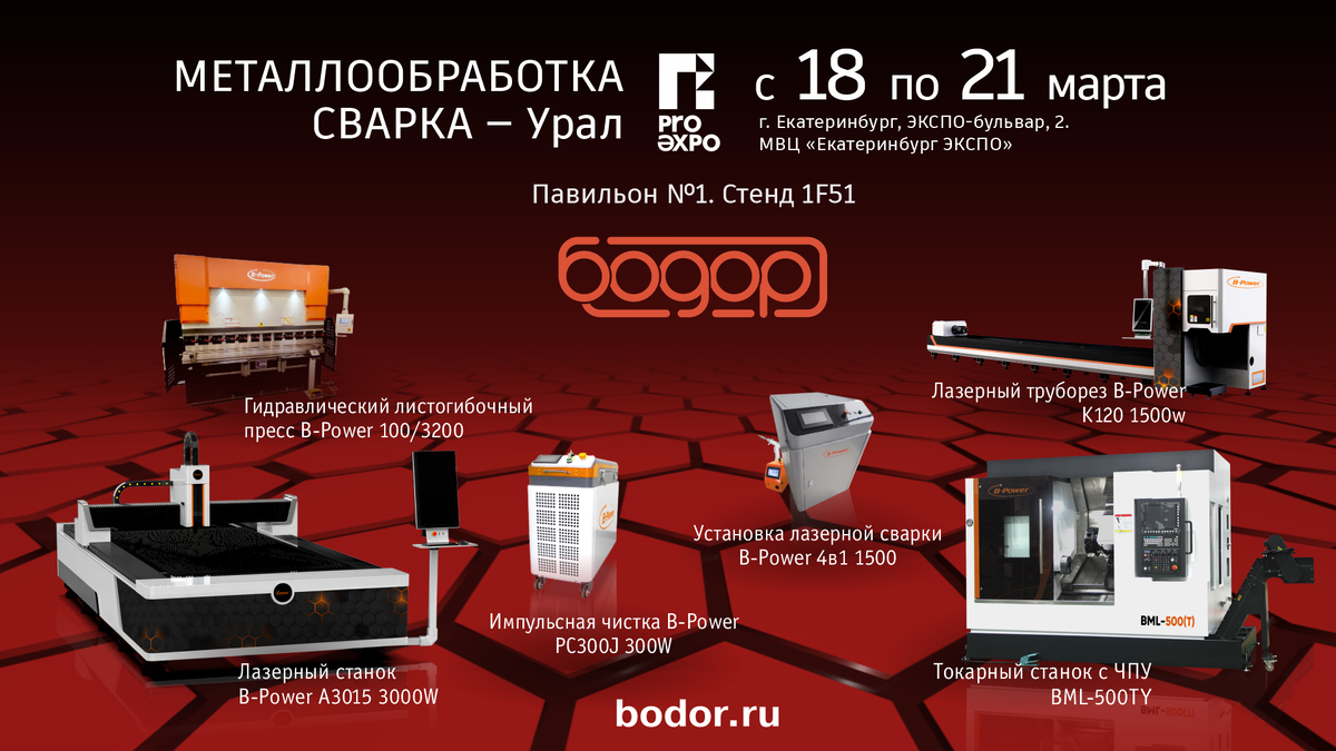 С 18 по 21 марта 2025 года ООО БОДОР примет участие в крупнейшей промышленной выставке Урала — 'Металлообработка. Сварка-Урал', которая пройдет в МВЦ «Екатеринбург ЭКСПО». 📍 Номер нашего стенда: 1F51 На нашем стенде будут представлены: 🔹 Токарный станок с ЧПУ BML-500TY Подробнее 🔹 Установка лазерной резки B-Power K1 1500W Подробнее 🔹 Гидравлический листогибочный пресс с ЧПУ B-POWER-P 40/2000 Подробнее 🔹 Установка лазерной резки B-Power A3015 3000W Подробнее 🔹 Универсальная установка лазерной сварки B-POWER 4 в 1 (1500) Подробнее 🔹 Установка лазерной импульсной очистки B-POWER PC300J 300W Подробнее Почему стоит посетить выставку? ✔️ Более 78% оборудования продается прямо со стендов участников. ✔️ Лидер среди региональных мероприятий в сфере металлообработки. ✔️ Возможность встретить ключевых клиентов, обсудить проекты и увеличить продажи. 📅 Дата: 18-21 марта 2025 года 🗺 Адрес: МВЦ «Екатеринбург ЭКСПО», ЭКСПО-бульвар, 2 📍 Номер стенда: 1F51 🌟 Ждем вас на стенде ООО БОДО