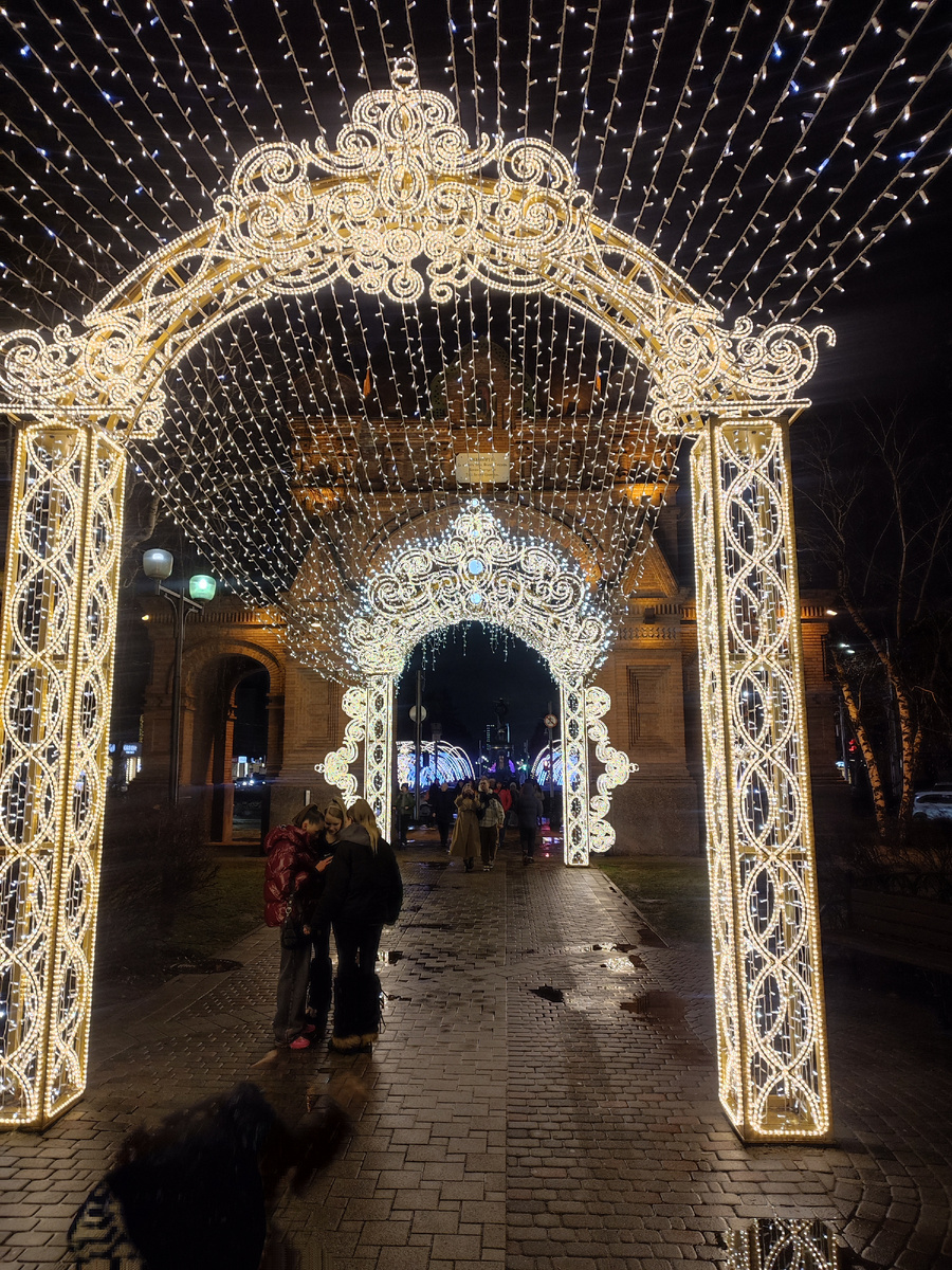 Ну что же, друзья, теперь пройдёмся по центру Краснодара и посмотрим, как Галицкий украсил улицу Красную к Новому году. Теперь здесь ночью много света, а ещё больше — туристов! Как сказал мой знакомый гид Андрей Ступаченко из проекта Краснодар пешком — кажется, сюда приехало полстраны посмотреть на новогодний Краснодар. Собственно, почему бы и нет, если посмотреть есть на что?) Взять хотя бы такую интересную ёлку: Есть, конечно, и более традиционные, например, вот эта, расположившаяся над памятником Шурику и Лидочке: Идём дальше... Как вам эти лотосы?) Народу не протолкнуться! А это прямо что-то из Аватара ). Все эти светящиеся нити колышатся на ветру. Волшебно! А здесь уже кристаллы льда, видимо? Актуально в бесснежную зиму. А вот мы и добрались до городской ёлки. Здесь не многолюдно, поэтому решил сфотографировать и своего малыша ) Вот такая получилась прогулка. Надо сказать, что все украшения находятся в современной части улицы. Исторический центр остался нетронутым. Ну и логичн