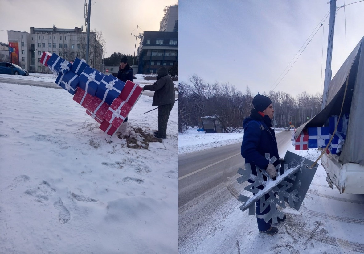 С улиц Красноярска начала убирать новогодние украшения. Зимний декор увозят на склад до следующей зимы, рассказали в управлении зелёного строительства.