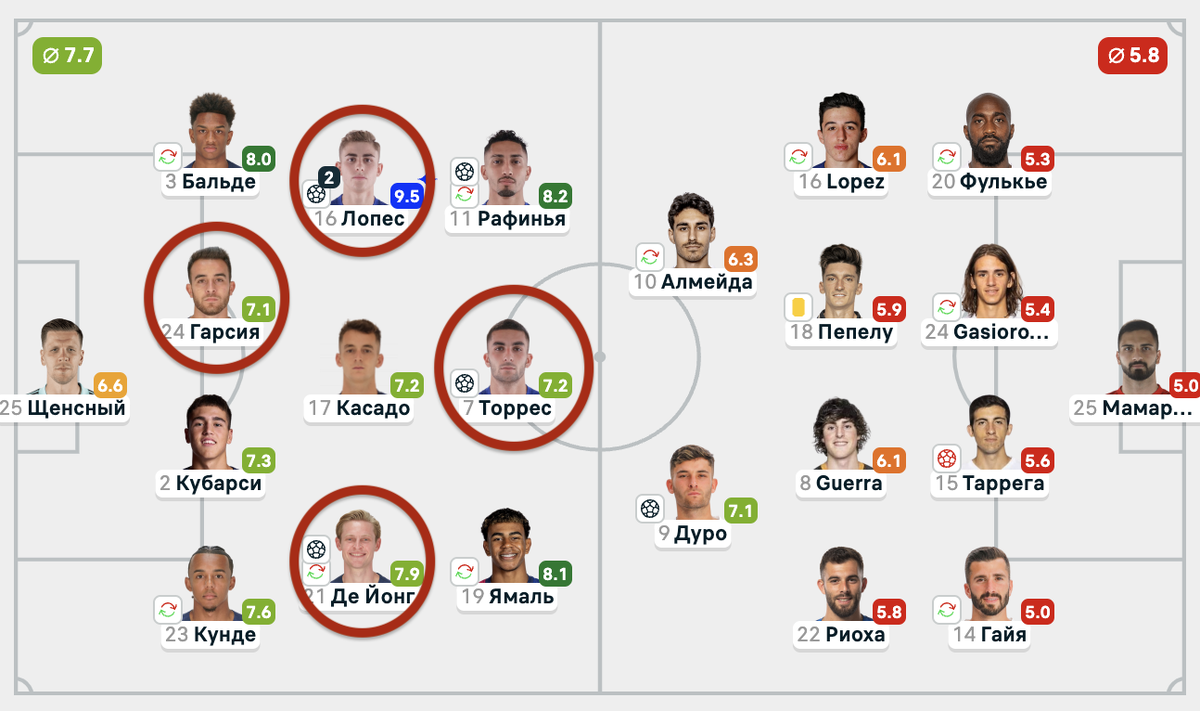 После передачи на Феррана он отстукивается с Ямалем и делает рывок, тем самым забирая сразу двух игроков соперника. Ламину открывается широкий коридор для передачи на Рафинью. Удар бразильца пришел в штангу, однако на добивании первым оказался Фермин.