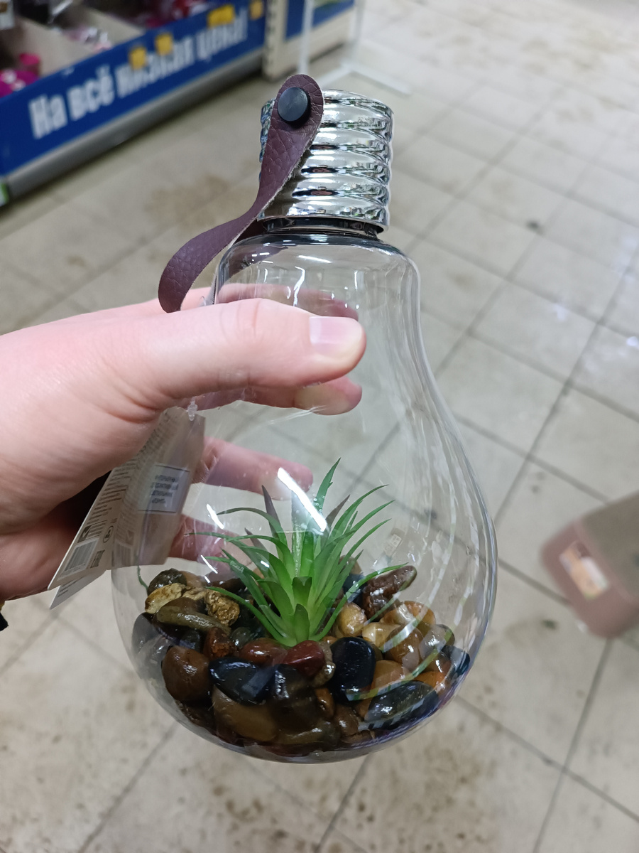 Приветствую! Много интересных новинок для вас я собрала в этом обзоре, опять еле удержала себя от покупок товаров, аналогов которых у меня уже есть... Но вам покажу, вдруг кому-то надо, у кого-то, возможно, еще нет похожих... И начну традиционно с товаров для декора интерьера. Здесь новые светильники привезли! Я сначала подумала, что это просто, как подвеска декоративная, а это оказался именно светильник в виде лампочки ильича, наполненной камушками и декоративным растением. Смотрится очень симпатично. Можно ставить на полку, можно повесить где-нибудь за ремешок. поближе наполнение покажу, чтоб вы оценили: Камушки блестят, они не перемещаются при переворачивании лампочки, не портится общий вид, все приклеено хорошо. На этикетке показано, как смотрится при освещении. и описание материалов. их тут было три варианта, надо в других магазинах тоже глянуть потом, возможно еще другие растения есть в коллекции. Следующий вариант покажу сразу крупно наполнение, форму светильника и так пока